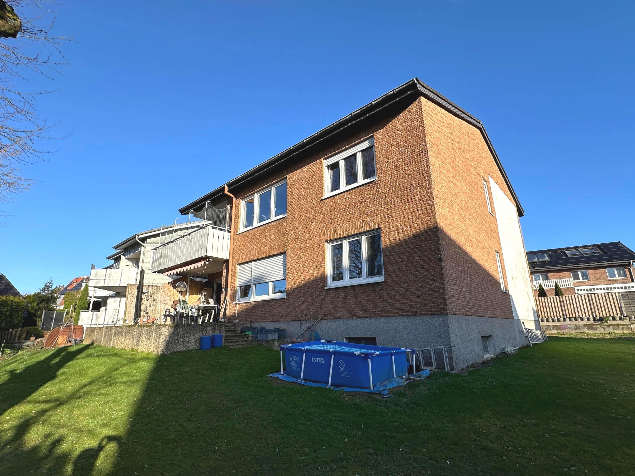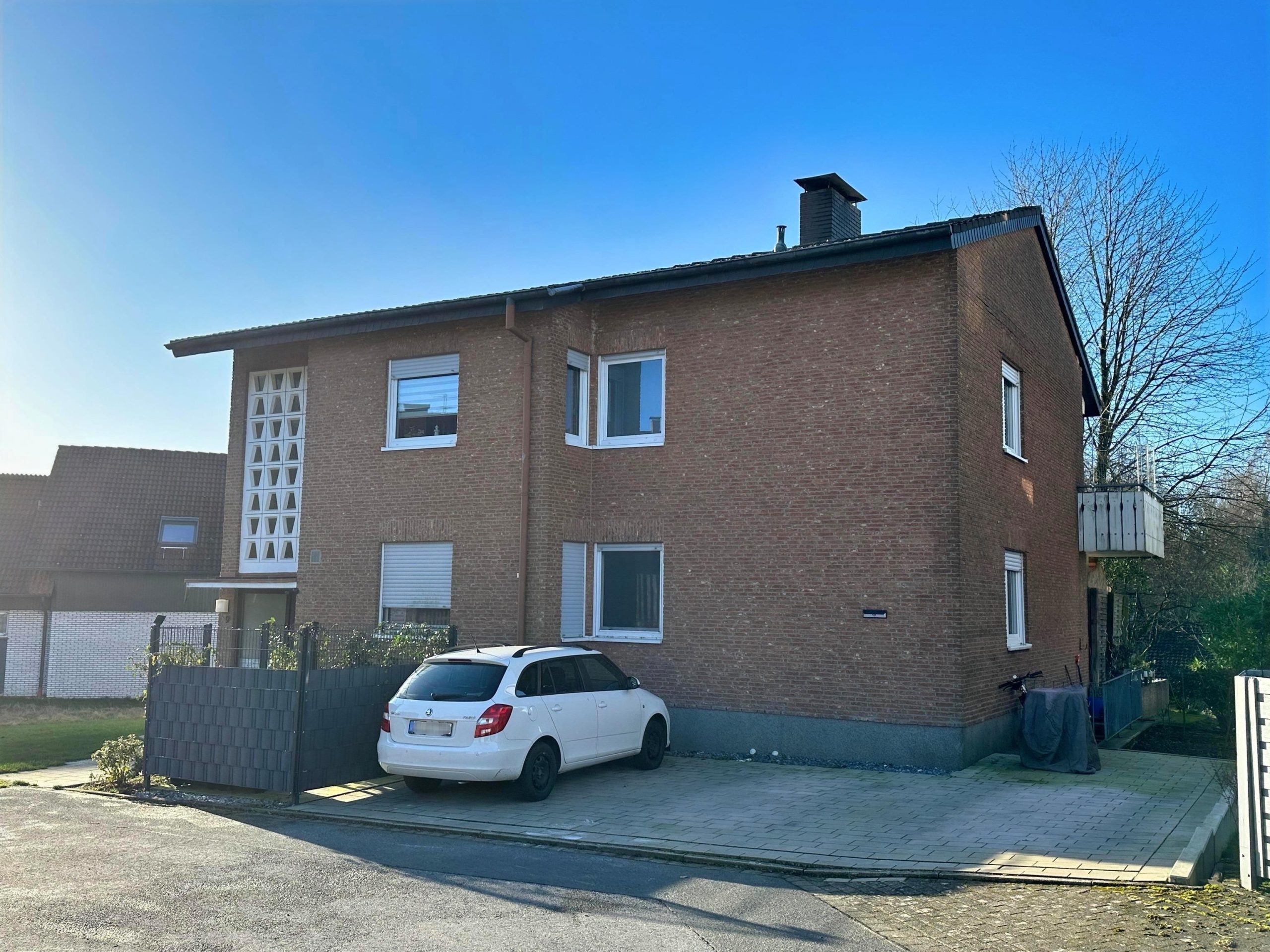 In schöner und zugleich ruhiger Wohnlage von Brake entstand im Jahr 1969 dieses verklinkerte Zweifamilienhaus auf einem Grundstück von 450 m². Die Immobilie wurde in Massivbauweise errichtet und verfügt über eine gesamte Wohnfläche von 195 m² (EG+OG mit jeweils 97,50 m²). Hier haben Sie die Möglichkeit, durch den Ankauf des Nachbargrundstückes das bestehende Wohnhaus durch einen Anbau zu erweitern. Der Bebauungsplan sieht ein großzügiges Baufenster hierfür vor. Die Erschließung ist über den bestehenden Weg gesichert, welcher sich im Besitz der Stadt Bielefeld befindet. Ausgestattet mit einer Ölzentralheizung, Kabel-TV, Glasfaser im Haus, isol. Kunststofffenster (neuwertig inkl. Dämmung der Rollladenkästen) und einem Vollkeller. Erweitert wird dieses attraktive Angebot durch die 3 Pkw-Stellplätze, die selbstverständlich bereits im Kaufpreis enthalten sind. Beide Einheiten sind seit 2016 bzw. 2017 vermietet. Mieteinnahmen auf Anfrage! (Exposé 10279)